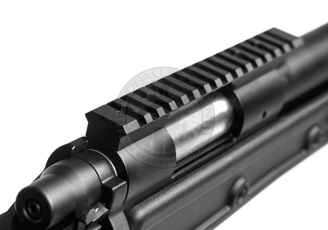 Geværet har en Picatinny-skinne på toppen og siderne, QD-slidser til rem og en Harris-type støttebensadapter på forenden.